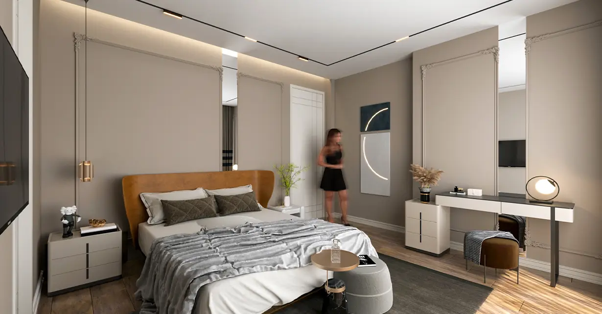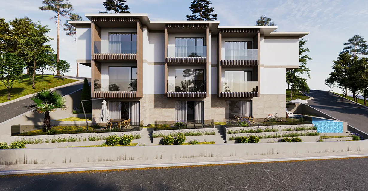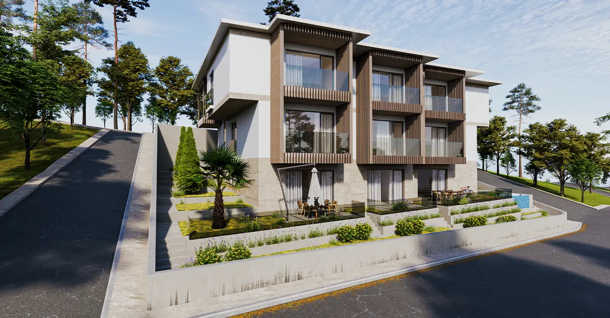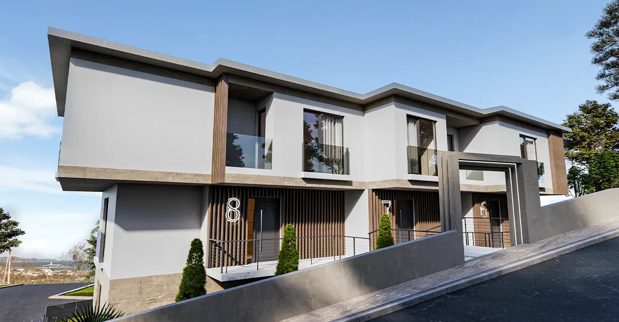 Proje; 3 adet sıralı bitişik villadan oluşmaktadır. Kapalı otoparklı proje de arsa dinamiklerine göre çözüm üretilmiştir. Yaşam ve mutfak alanı alt katta, giriş misafir odası ve oturma odası orta katta ve yatak odaları da üst katta yer almaktadır.