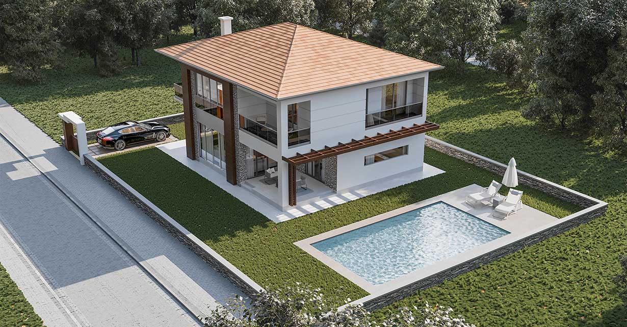 2 katlı yapı, maksimum bahçe alanı elde etmek amacıyla, yapı çekme mesafesine dayandırılmıştır. Bahçe girişinde araç otoparkının bulunduğu yapı, kısmi bodrum katına da sahiptir. Giriş katta teras, ada mutfak, salon, şömine, misafir yatak odası; üst katta ise 4 adet yatak odası bulunmaktadır. Bina cephesinde ahşap desenli kaplamalar tercih edilmiştir.