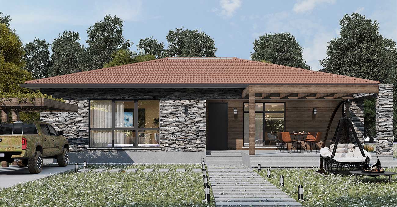 Tek katlı yapı; 3+1 olarak açık mutfak sistemiyle tasarlanmış ve köy dokusuyla uyum gösterecek cephe kaplamaları tercih edilmiştir.